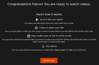 All titles are free to stream with your library card and will be available for three days after checkout. Each month you'll get 20 tickets to use toward content. Kanopy Kids titles don't use tickets, so you can watch as many kid-friendly titles as you'd like. Watch on your computer, or use the IOS, Android, or Kindle Fire app. You can also watch on your television using a Roku or Chromecast.